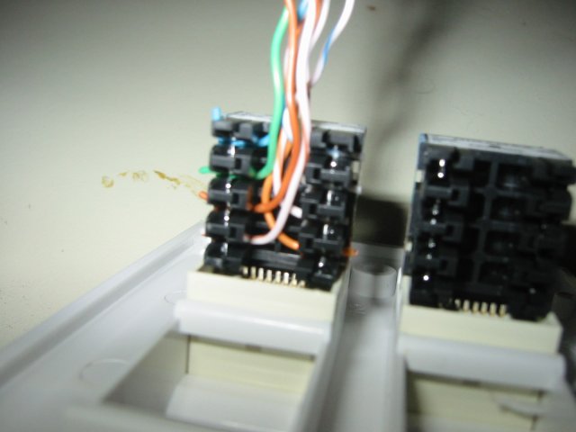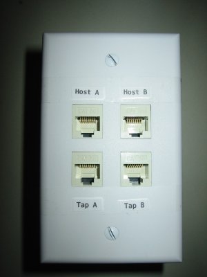 Next put in a jack in the spot directly below it. This is the Tap A jack. Lace the orange wires from the host A jack to this jack and punch them down. You should still have several inches of the orange wires hanging off at this point. Now put in the host B jack to the right of host A. Lace all the wires except for the green ones (this includes the orange ones from Tap A) and punch them into the host B jack. Now without putting the tap B jack in the faceplate lace the green wires to it and punch them down, then lace the remaining length of green wires to the host B jack and punch them down there as well. Now put the tap B jack onto the faceplate.