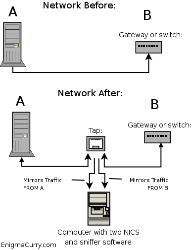 In the above diagram, A is a single computer (or it could be a switch) and B is a switch (or it could just be another computer, it doesn't really matter what these devices are). The Tap splits the connection between A and B. The connection inside the box is unbroken, that is, A is still physically attached to B. However, along the way, the transmit lines of A get mirrored as well as the transmit lines of B. These mirrored data lines are taken to a computer with some sort of sniffing software installed. Using a Tap requires the sniffing computer to have two network cards. One for A's transmissions and one for B's. So as to completely isolate the sniffer computer from the network, the sniffer's transmit lines are not connected. The sniffer computer can only "see" the data but can't "touch" it, effectively making the sniffer computer invisible on the network.