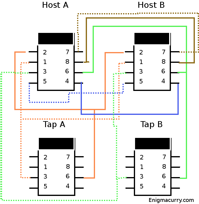 The wiring is really quite easy. We have four ports. One that connects to host A, one that connects to host B and two tap ports. One tap port for all of host A's transmissions and one tap port for all of host B's transmissions. You wire host A to host B straight through pin for pin the same. Then just continue the transmission lines for each host down to the tap port for that host.